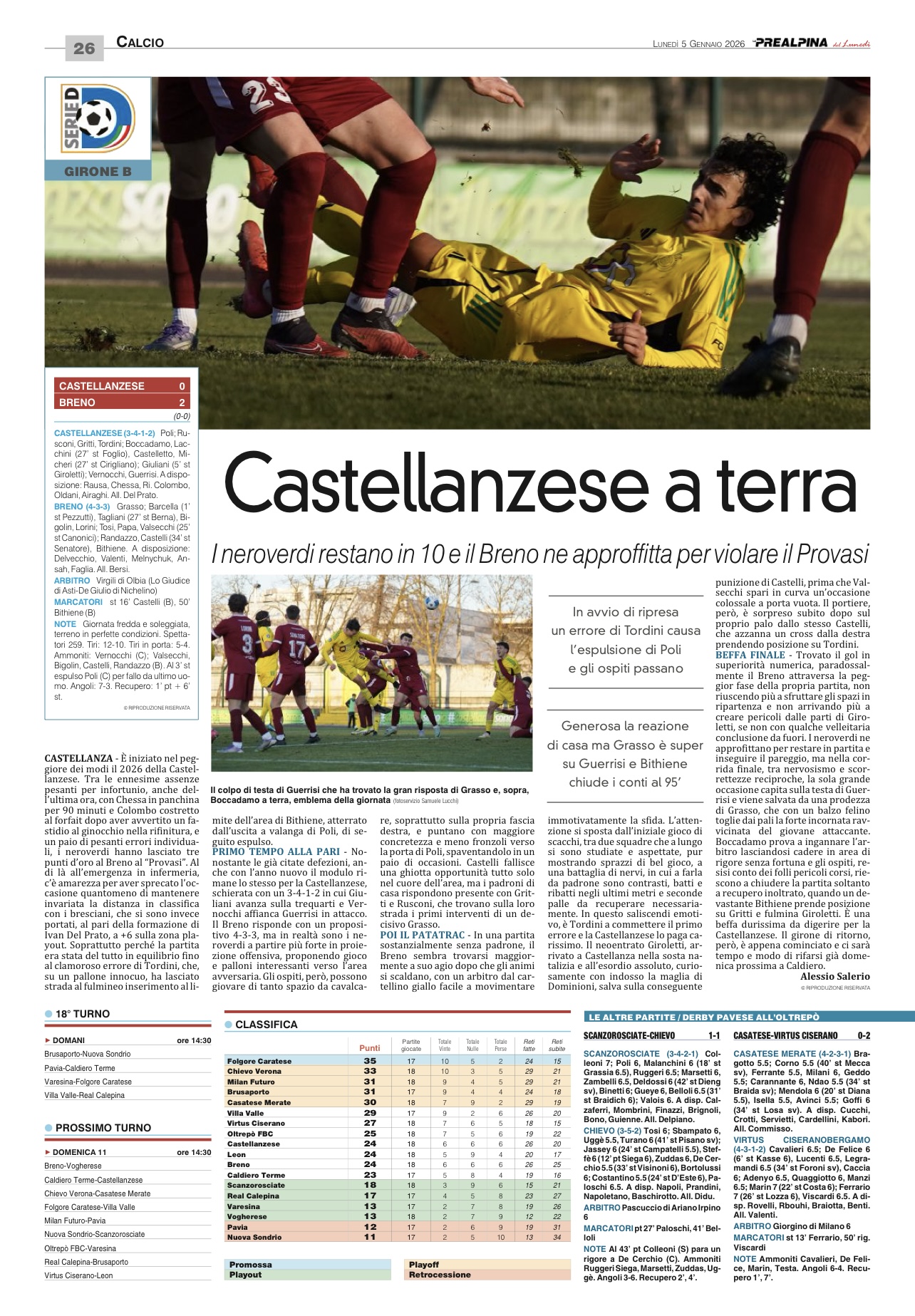 Serie D, la Castellanzese in dieci crolla contro il Breno
